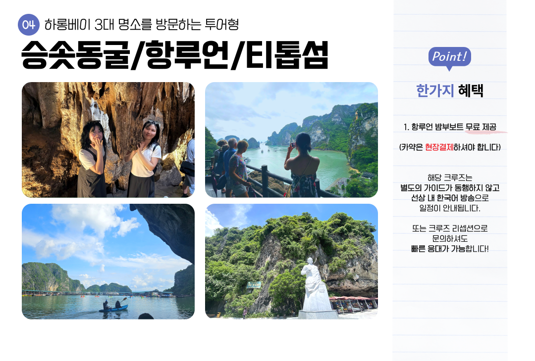 특히 하롱베이 크루즈 관련 리뷰에서는 제공된 식사의 품질, 크루즈의 규모, 그리고 작은 배로 갈아타는 경험 등이 긍정적으로 평가되었습니다. 고객들은 아이러브베트남을 통해 예약한 여행에서 편안하고 즐거운 시간을 보냈다고 언급하며, 특히 가족 단위의 여행객들 사이에서 높은 만족도를 보였습니다.