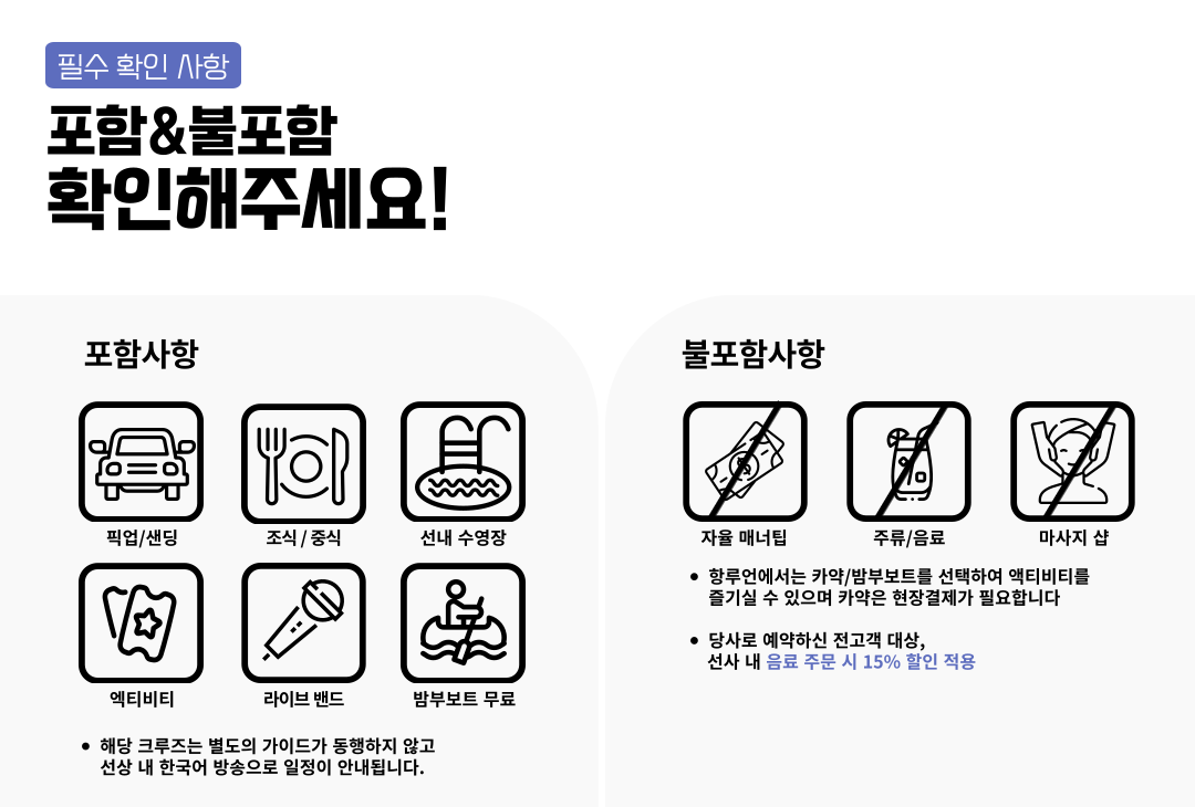* 지금부터 이하 내용들은, 당일 크루즈 현장 상황에 따라 예고 없이 변경될 수 있습니다.