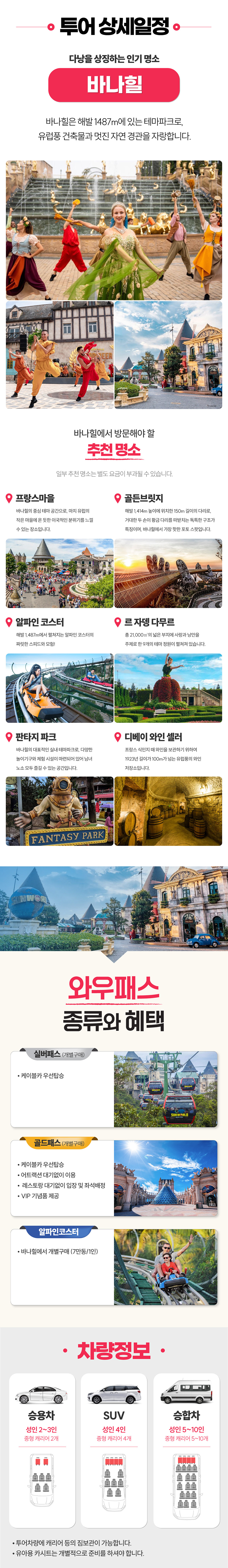 1. 단독차량 및 기사님 2. 바나힐 E-티켓(입장권, 케이블카, 어트랙션) 3. 투어 차량 내 짐보관 4. 투숙호텔 픽업 및 드랍 5. 공항드랍 서비스