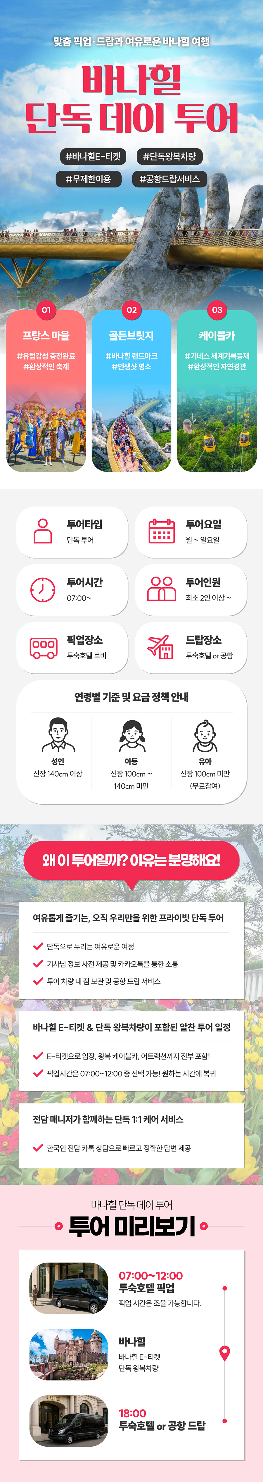 1. 픽업미팅(07:00~12:00) ♦ 1. 픽업 시간 10분 전에 투숙호텔 로비에서 대기를 합니다. ♦ 2. 픽업 시간에 기사님을 만나 차량에 탑승합니다. 2. 바나힐(~17:00) ♦ E-티켓 QR코드를 스캔해 바나힐에 입장한 후 케이블카를 탑승합니다. ♦ 골든브릿지, 프랑스마을, 링엄사에서 자유시간을 가지며 여유롭게 둘러봅니다. ♦ 약속 시간 30~40분 전에 케이블카에 탑승합니다. ♦ 케이블카 탑승 전에 기사님께 카카오톡 메시지를 보냅니다. 3. 투어종료 ♦ 투숙호텔 또는 공항으로 안전하게 이동하여 투어를 종료합니다.