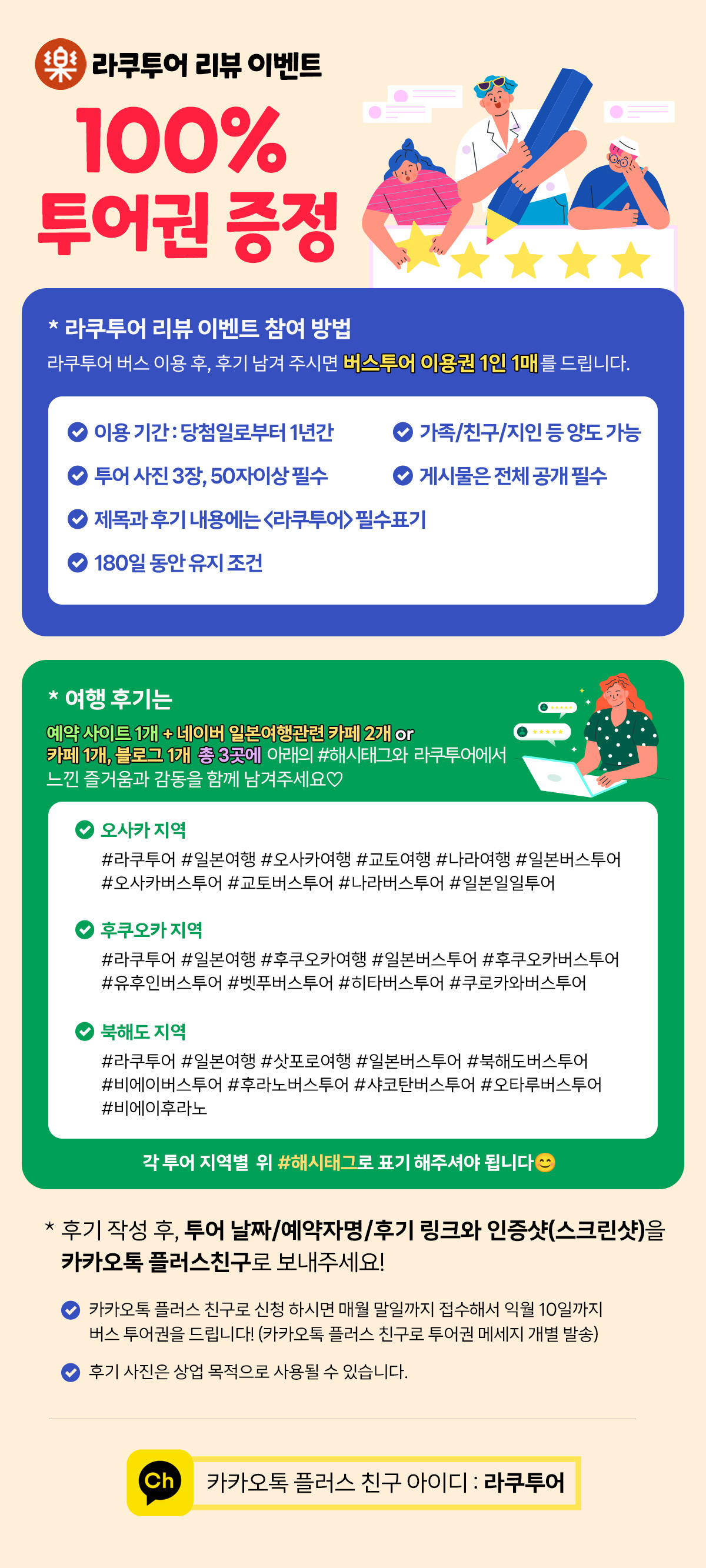 즐거울 락(樂) : 라쿠투어안녕하세요. 여행의 즐거움을 찾는 즐거울 락(樂) : "라쿠투어"입니다.라쿠투어는 일본 여행을 새롭게 선보이는 일본 전문 여행사이며,오랜 경험의 베테랑 여행 가이드와, 전문적인 경력과 노하우를 가지고 있는 팀원들로 구성되어 있습니다.여행자분들의 선택에 후회가 없도록 여행의 시작부터 끝까지 100% 고객만족을 위해 노력하며,안전과 즐거움이 배가 되도록 최선을 다하고 있습니다.[ 일본의 BEST 코스로만 진행되는 알찬 투어! ]현지 가이드의 친절한 설명으로 라쿠투어와 함께라면 모든 여행자분들이 일본의 매력을 더욱가까이서 느끼며, 만족하실 수 있는 여행이 되실 수 있습니다.소중한 사람들과의 즐거운 추억 한 페이지 만들어 드리겠습니다 파트너 상품보기