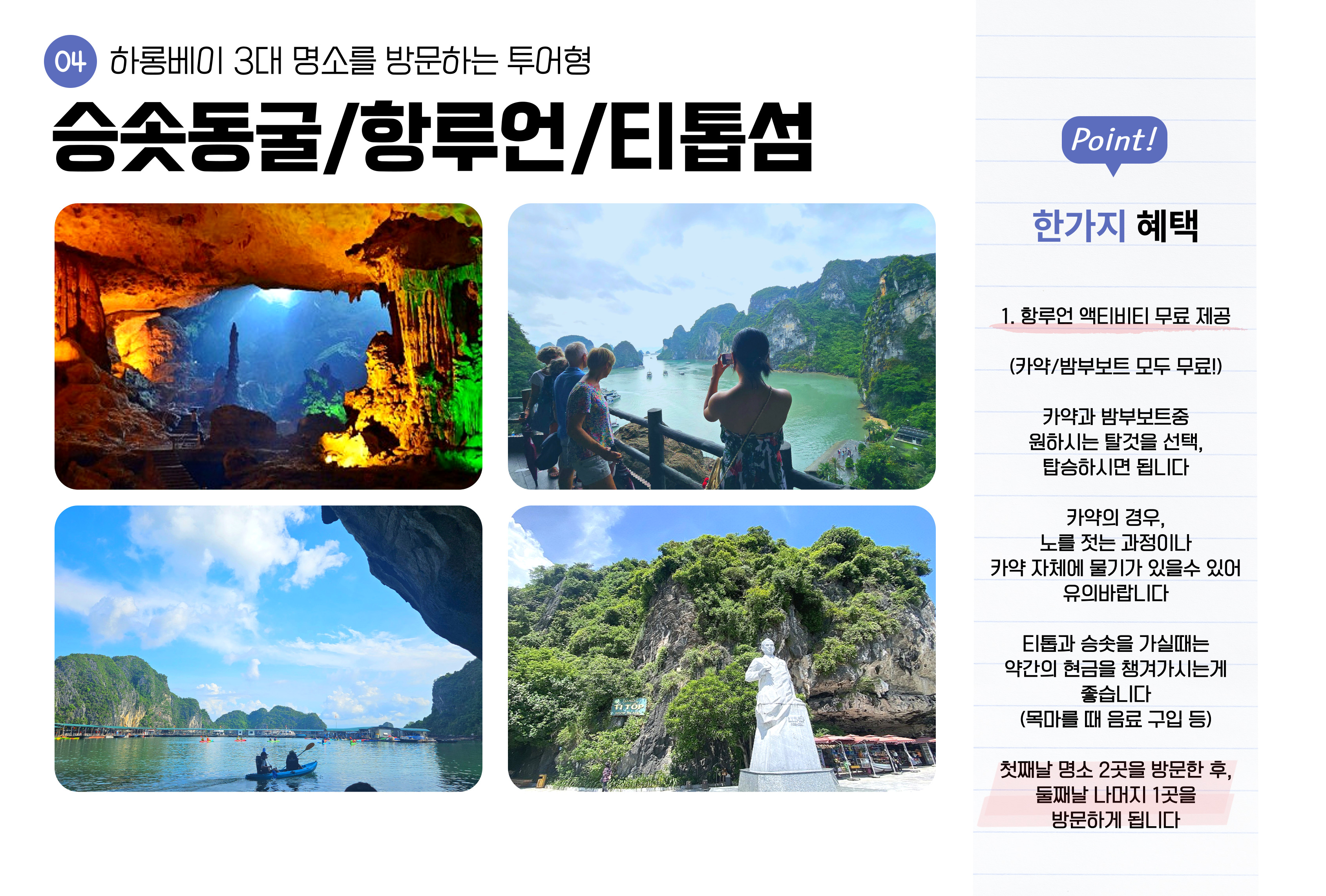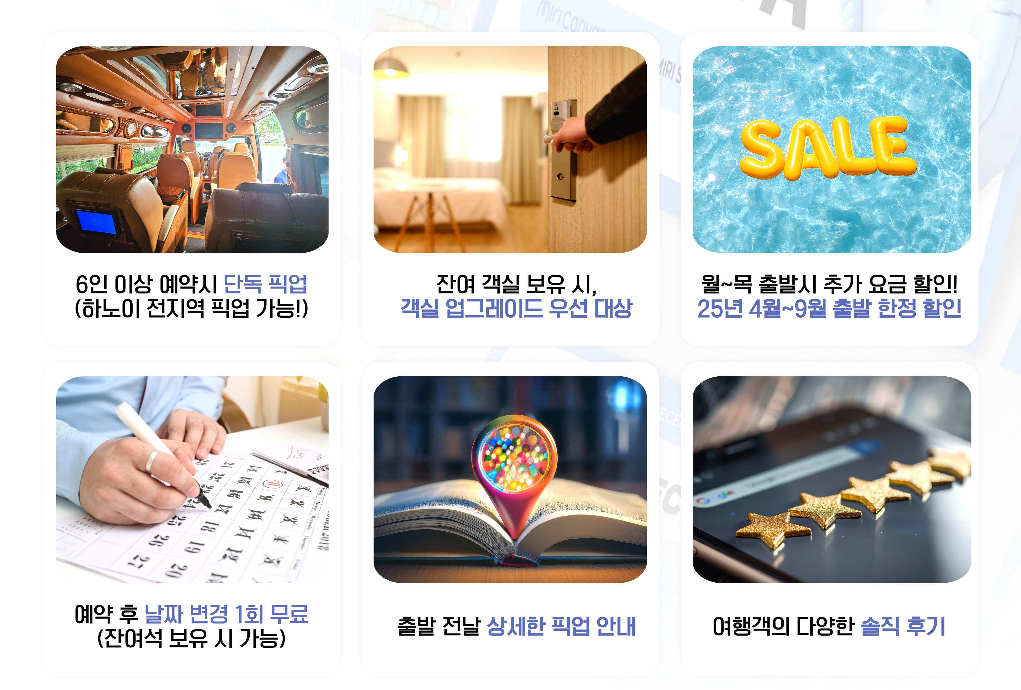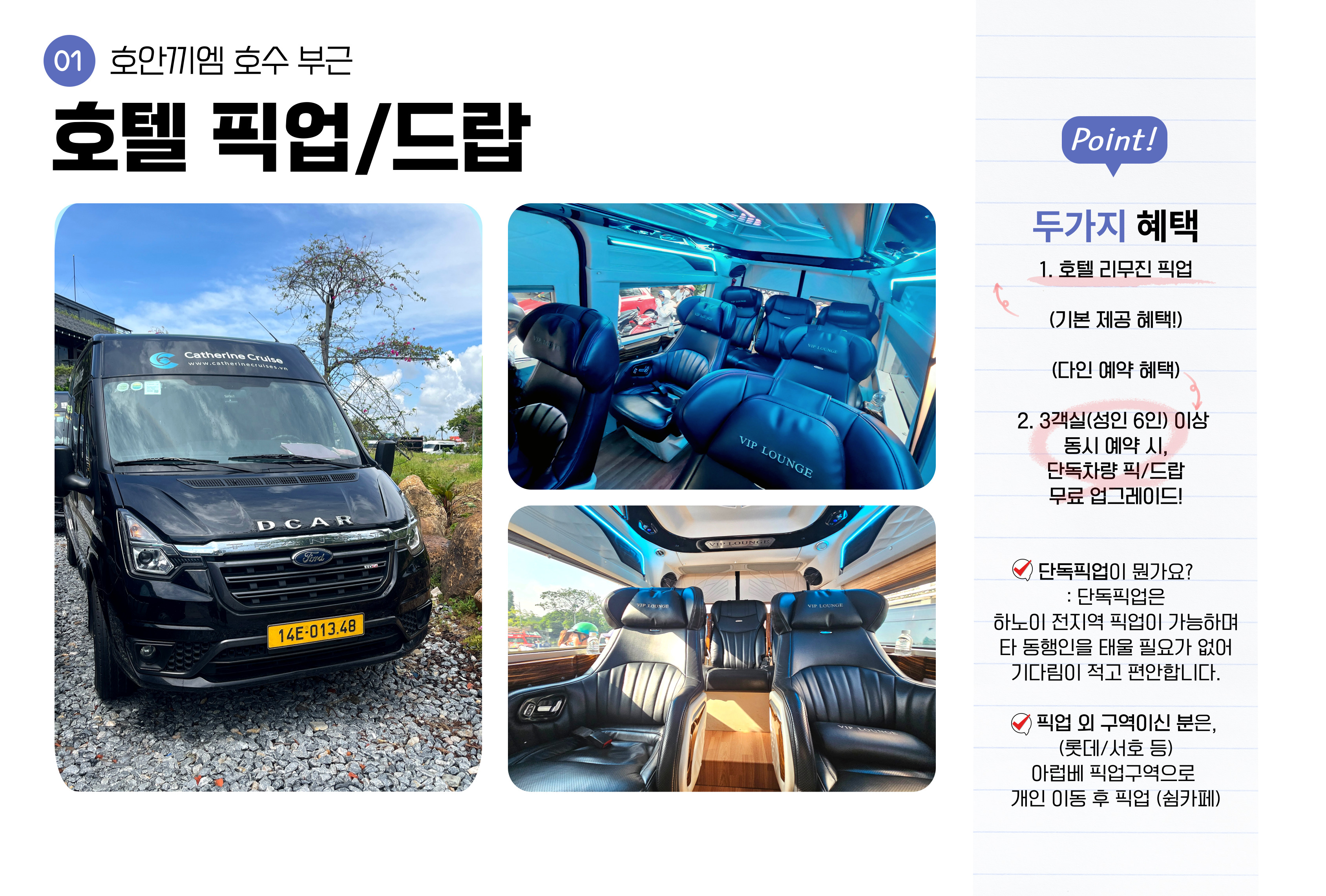 - 픽업 시간 : 호안끼엠 호수 인근 구역 여행자 거리 각 호텔로 리무진 방문 픽업(08:15~08:45AM)